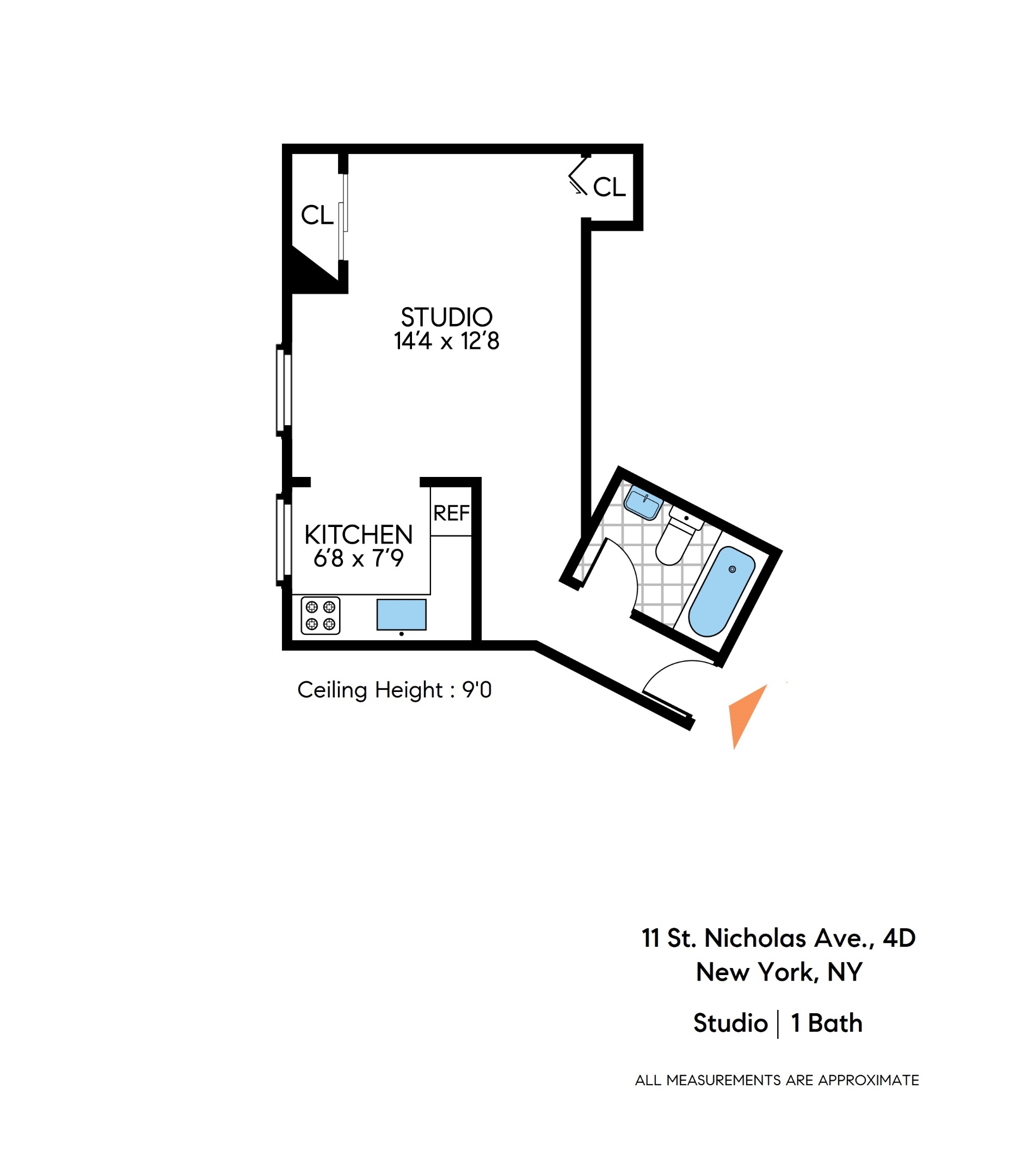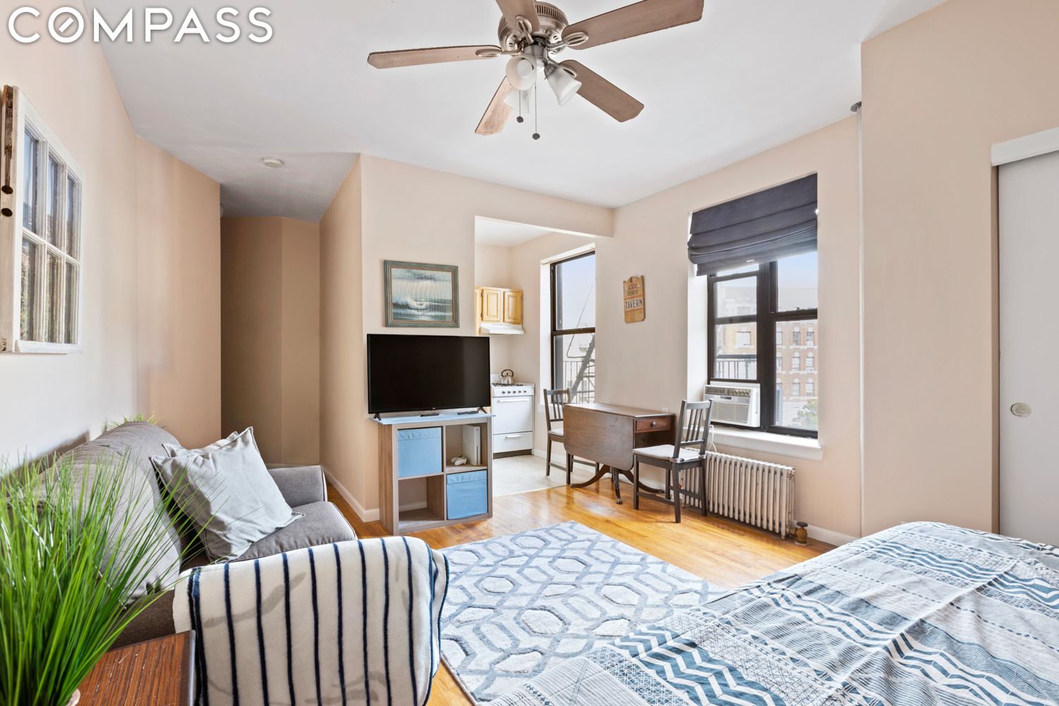 Rarely available studio apartment with big dramatic windows with clear eastern views and amazing natural light. The apartment has very high ceilings, a large open kitchen and spacious layout that can fit a bed, small couch, dining area and a desk. The apartment is in a walk up building on the 4th floor - 3 flights up. No elevator.