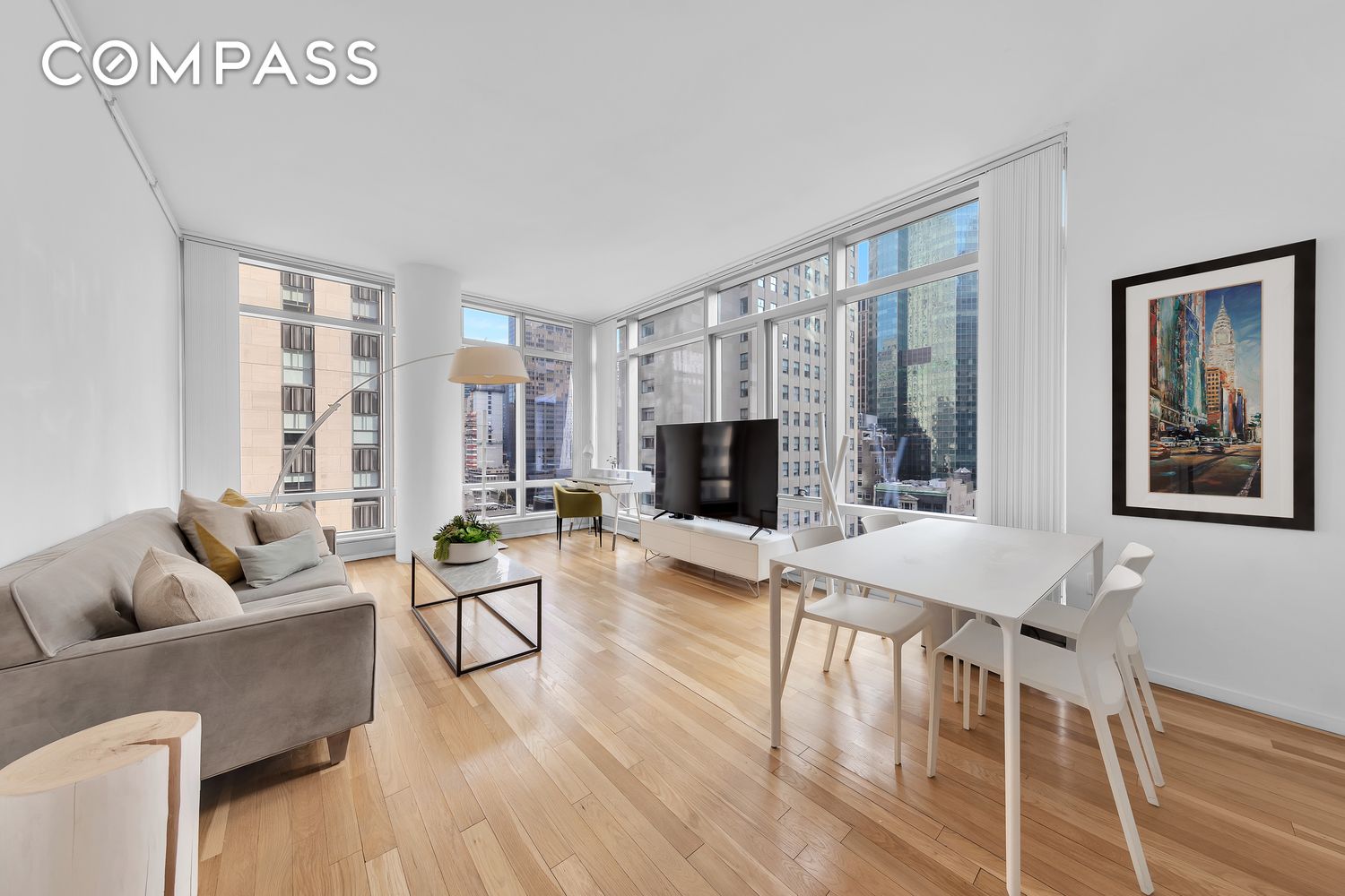 Fully FURNISHED 1-bedroom, 1.5-bath apartment located at the center of Manhattan. Residence 18B offers North and East exposure. This home features 10-foot ceilings and floor-to-ceiling windows overlooking Rockefeller Center. It includes a sleek Italian stainless steel kitchen, a relaxing primary bathroom with double sinks, a deep soaking tub, and a mosaic-tiled shower. Additional conveniences include an in-unit washer/dryer, central A/C, and plenty of closet space.
